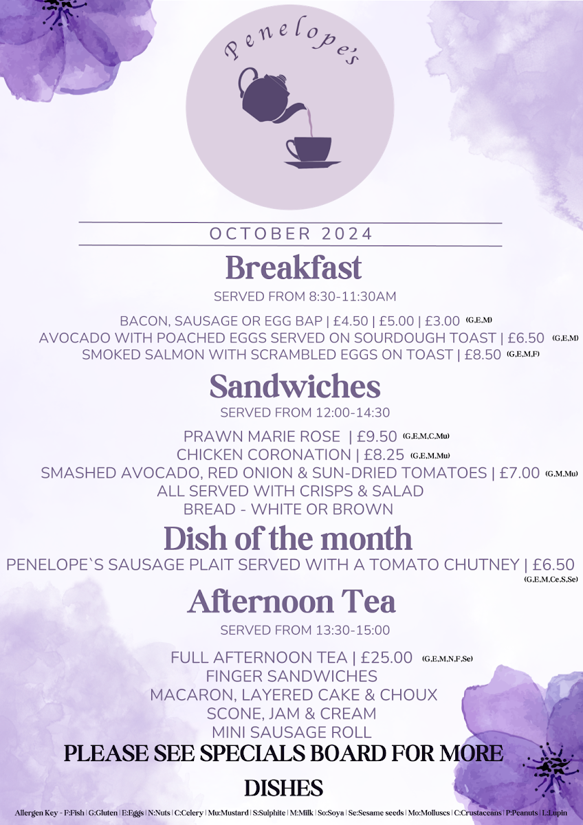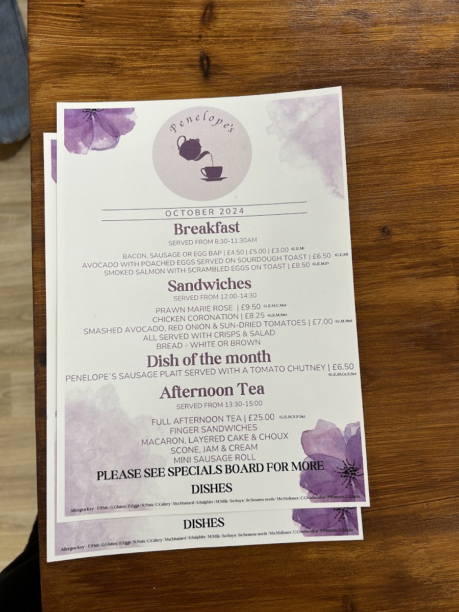 The menu at Penelope’s offers a selection of food and drink items suitable for breakfast, light lunches, and coffee breaks. The offerings include a variety of hot beverages such as coffee, chai, and specialty hot chocolates, alongside homemade cakes, scones, and flapjacks. Light meal options are available, including sandwiches, soups, and egg-based dishes, often accompanied by fresh, locally sourced bread.